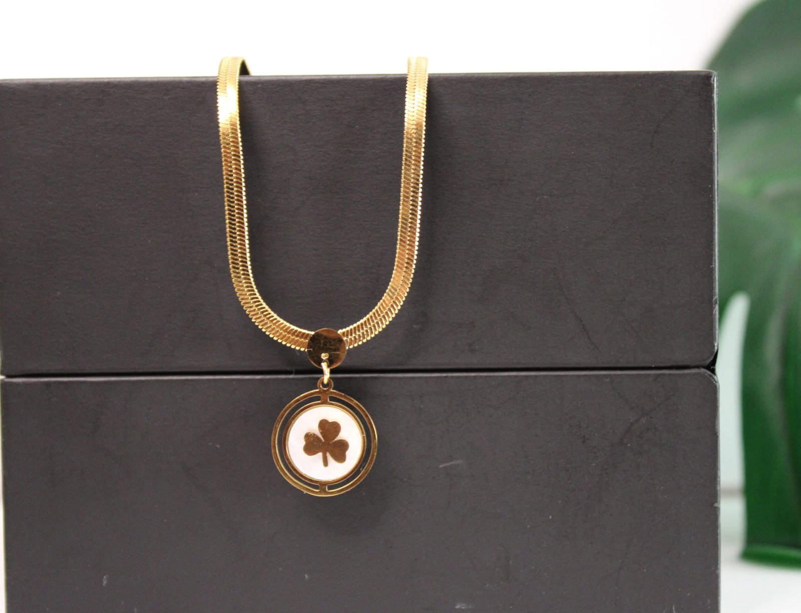 «Descubre nuestra cadena dorada de acero inoxidable con colgante de trébol. Un amuleto de la suerte elegante y resistente, ideal para regalar o brillar cada día.»
